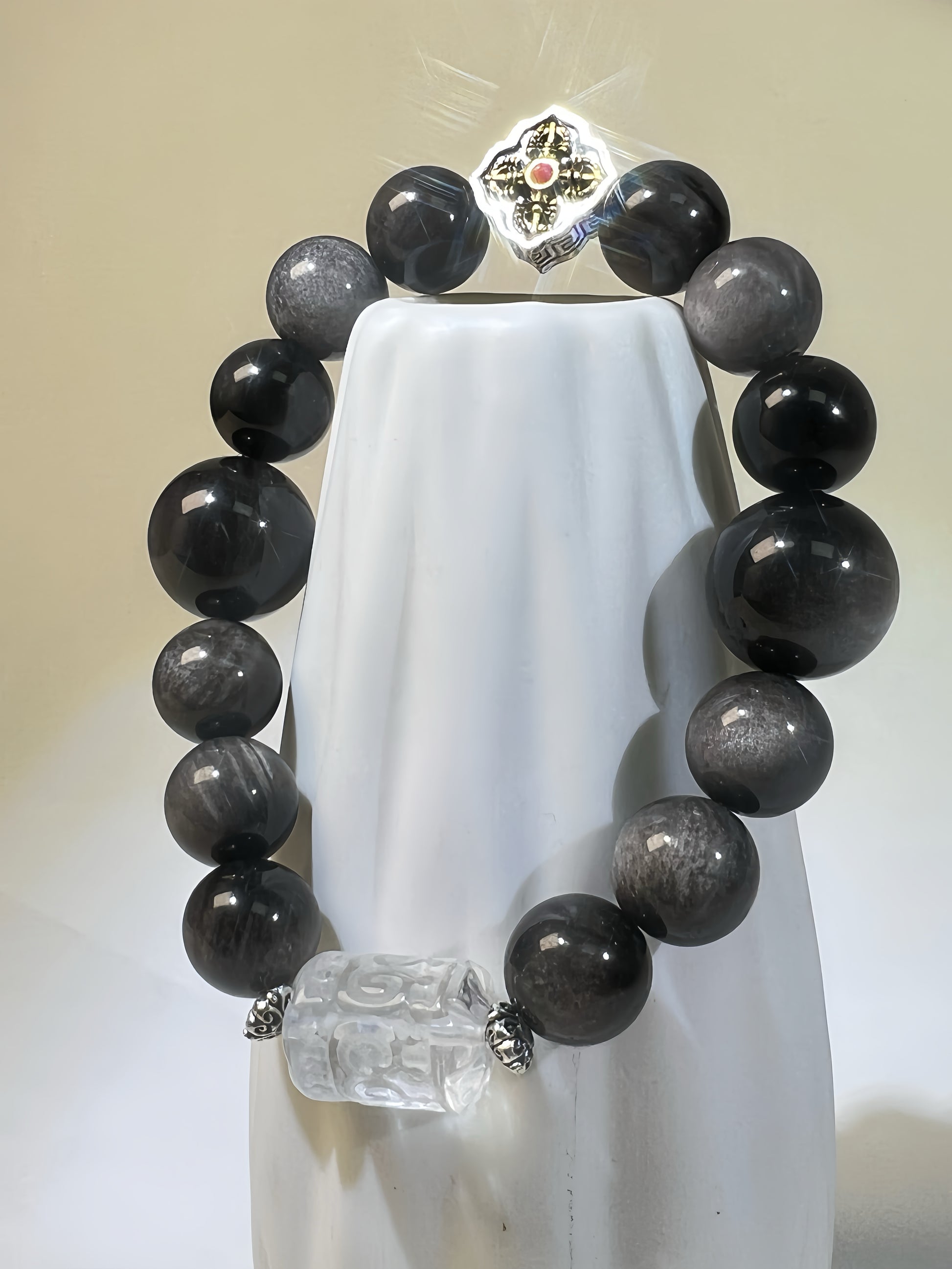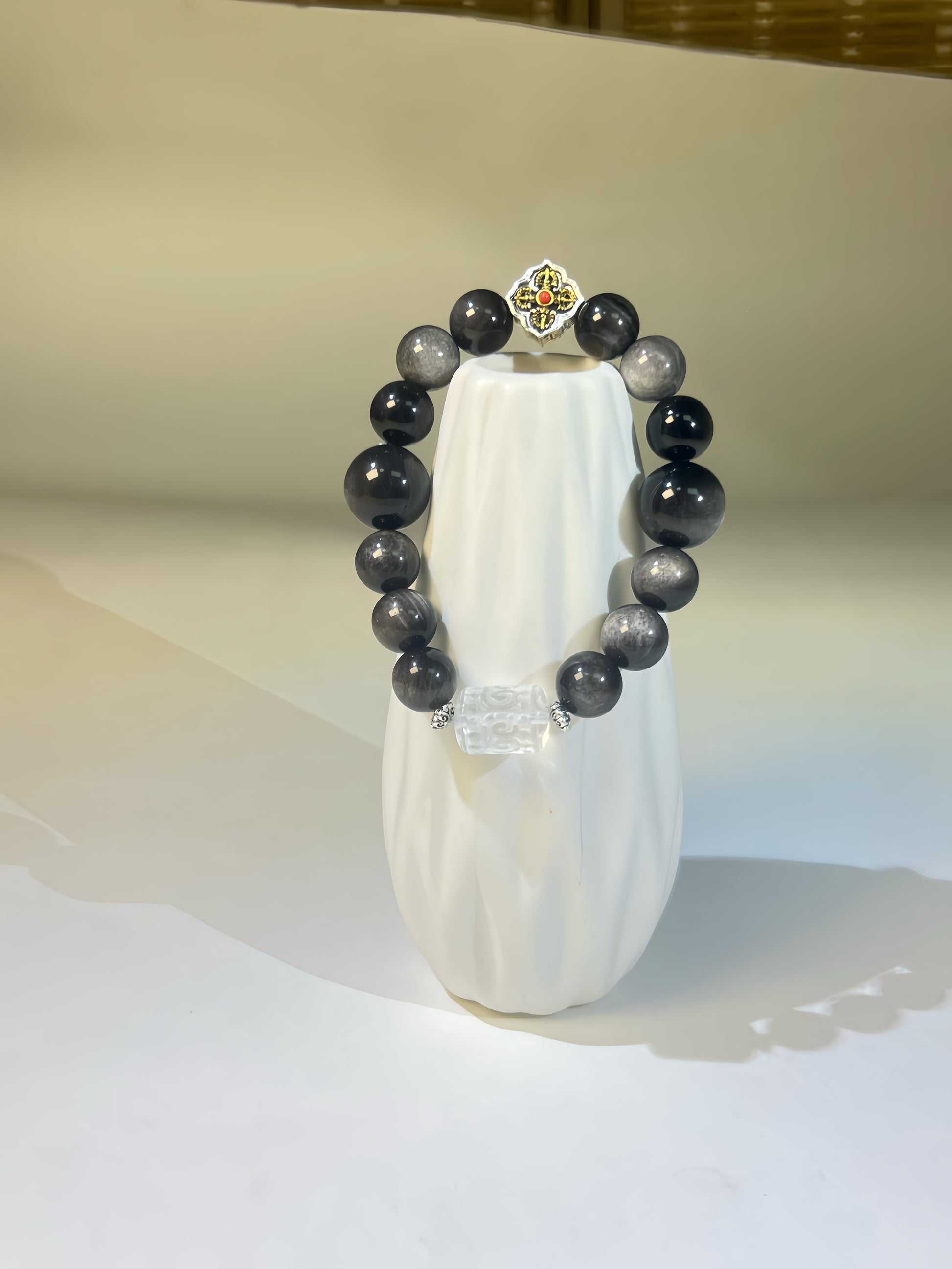 Tibetan Style Obsidian & White Crystal Mandala Carved Barrel Bead Bracelet